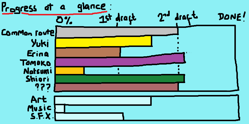 And so began the journey. I naively drew out a road map of sorts with ideas for the various routes and endings, not realising just how much writing, drawing and general fucking around I was taking on. It was only by about November '19 when I had a completed first draft of the script for Yuki's path (pushing 60,000 words, with a shitload of sprites, backgrounds and other drawn objects) that I sat back and realised I'm going to have to do that again, four times over at the very least. Then proof-read, tidy up, rewrite, draw more stuff if necessary, put the sound effects in, actually make the sound effects... Whatever delusions I had of this being a quick and dirty project were gone that day.